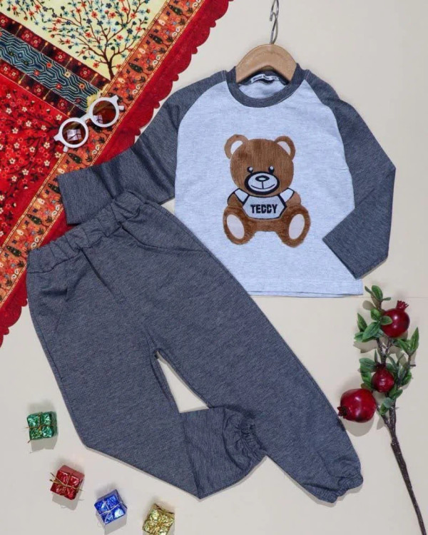 بلوز شلوار پسرانه طرح شیت خرس تدی پارچه ملانژ لاکرادار سایز ۴۵_۴۰